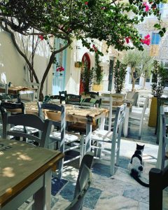 On trouve, vers le port, des bars en tout genre, et dans les petites rues de la cité, de nombreux magasins de designer grecs, des restaurants branchés et des chats. Oui oui, des chats !